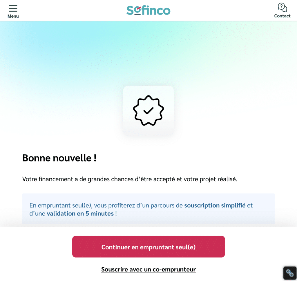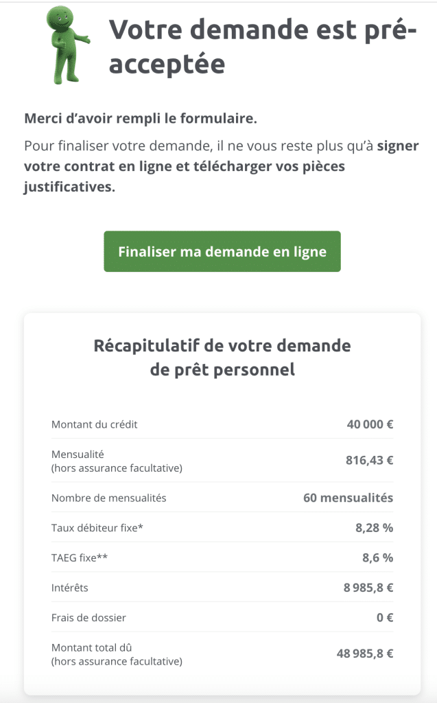Nous avons simulé une demande chez Sofinco et Cetelem, à partir de notre profil dit “très correct” dont les caractéristiques se trouvent ci-dessous. Les deux simulations nous ont donné une réponse favorable. Sofinco propose un taux inférieur à celui de Cetelem, nous vous recommandons de favoriser cet établissement.