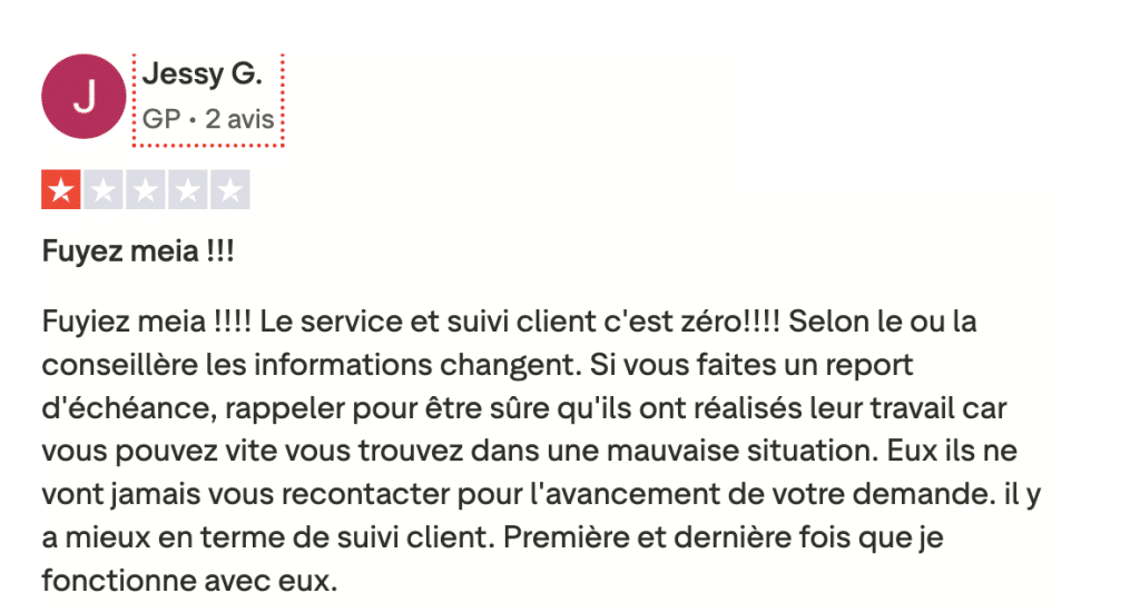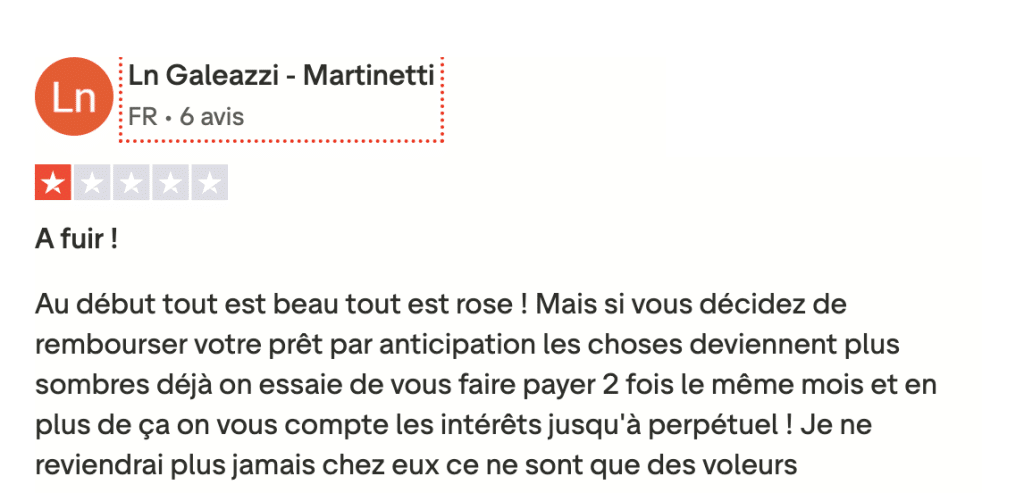 Les avis négatifs révèlent que le service client est incapable de résoudre un problème de remboursement anticipé ou de report de mensualités, ce qui nous semble essentiel lorsque vous souscrivez un crédit.